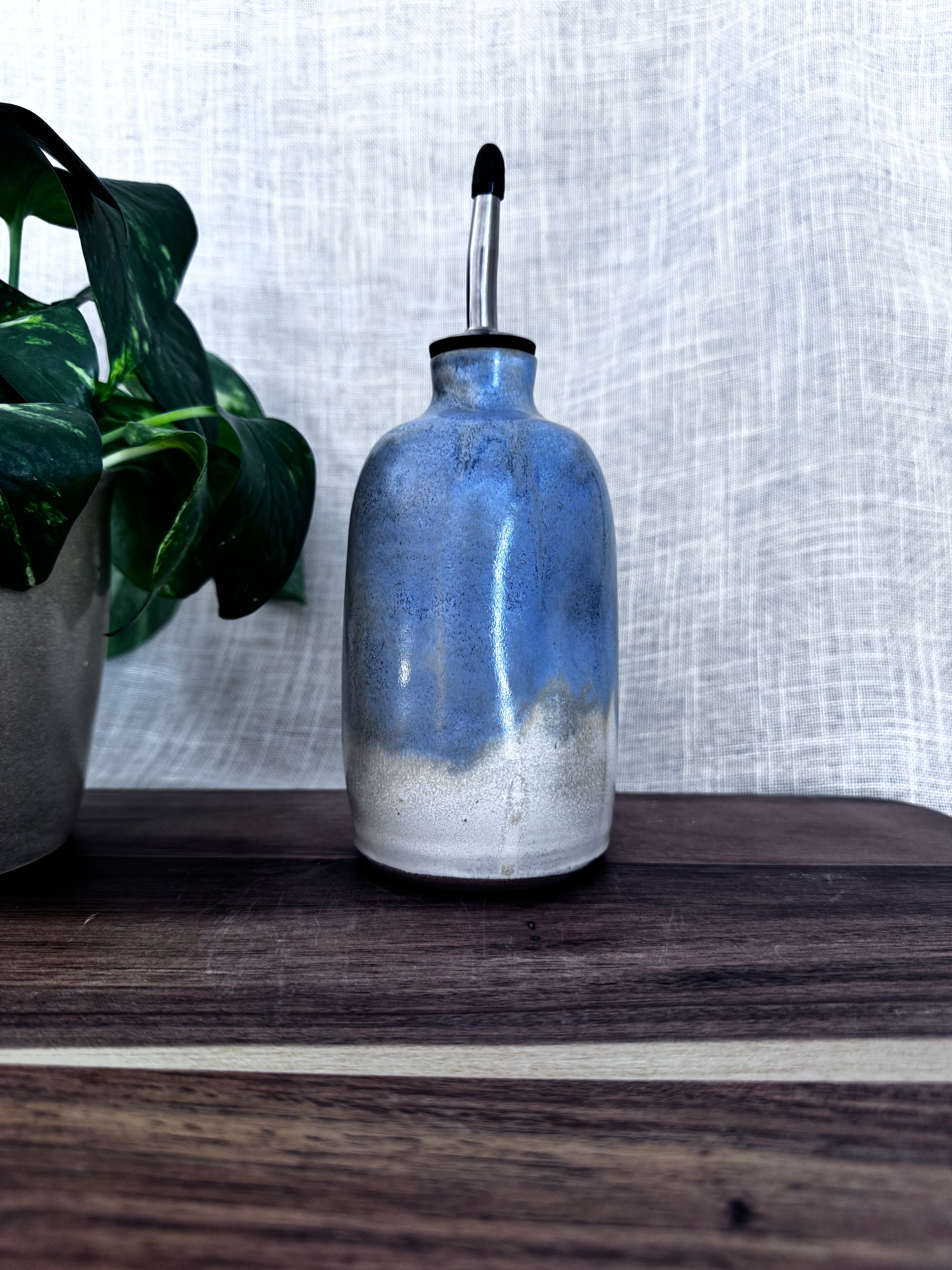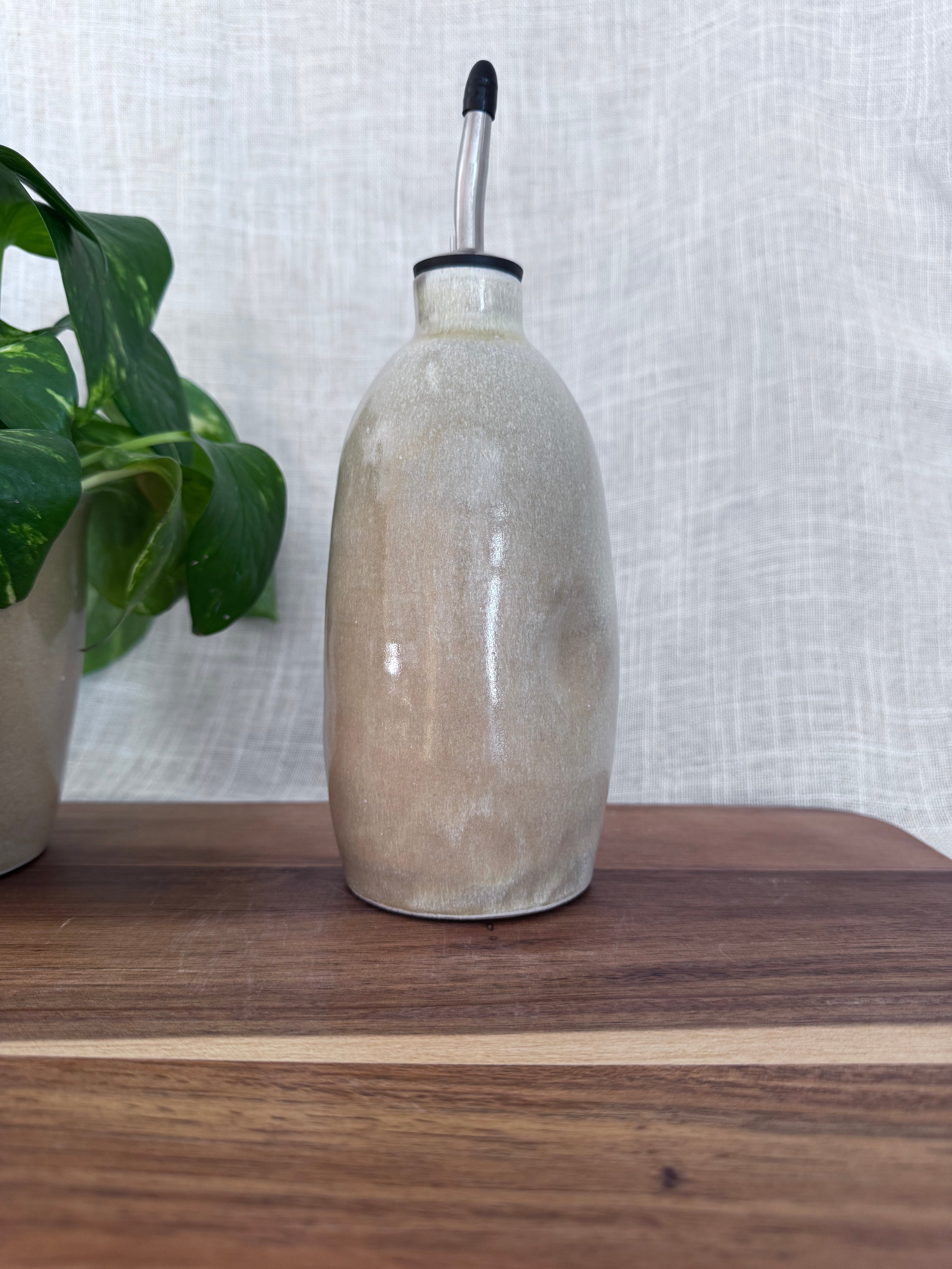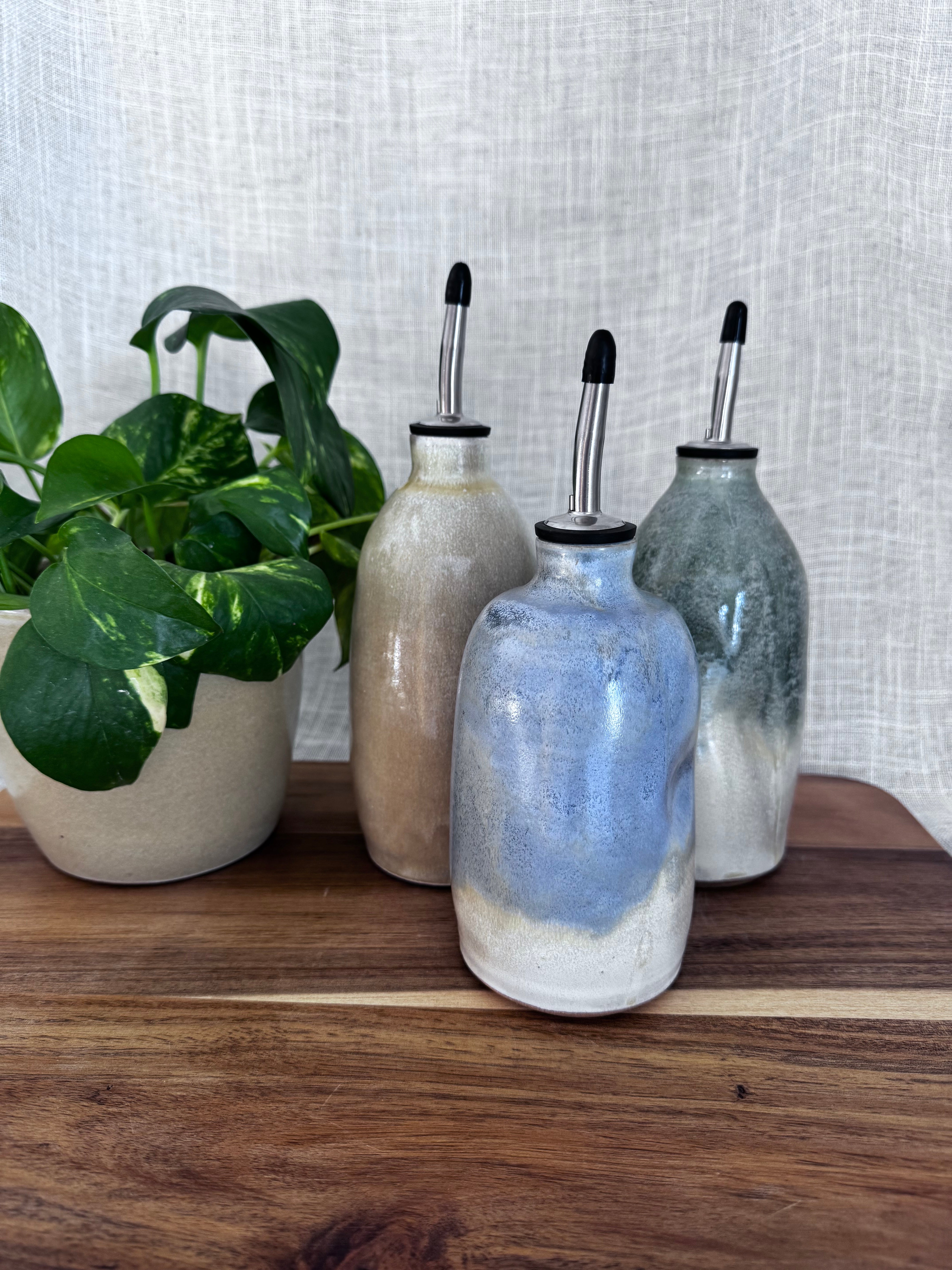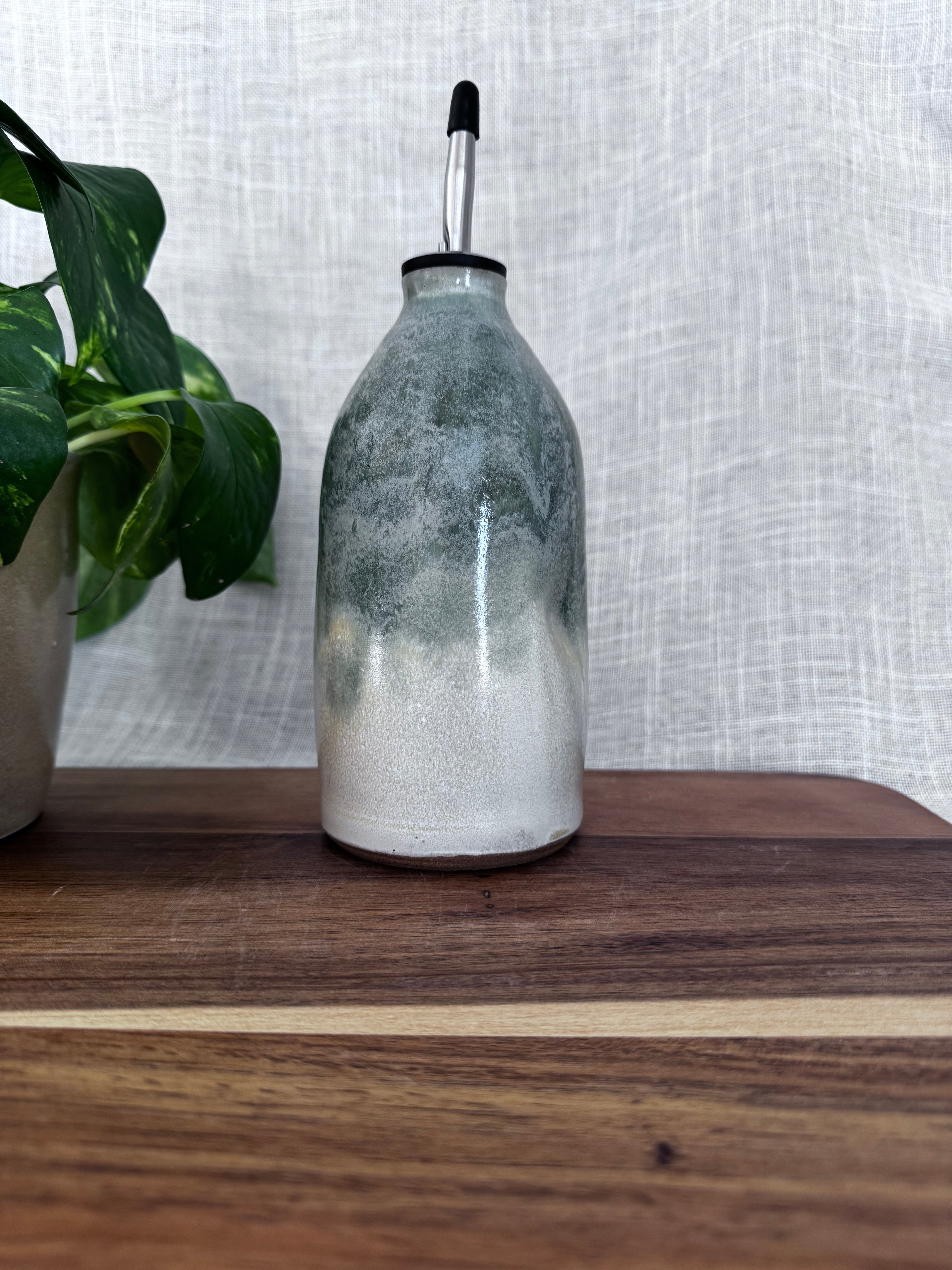 Keep your oil or salad dressing in a handmade dispenser. Includes stainless steel spout.